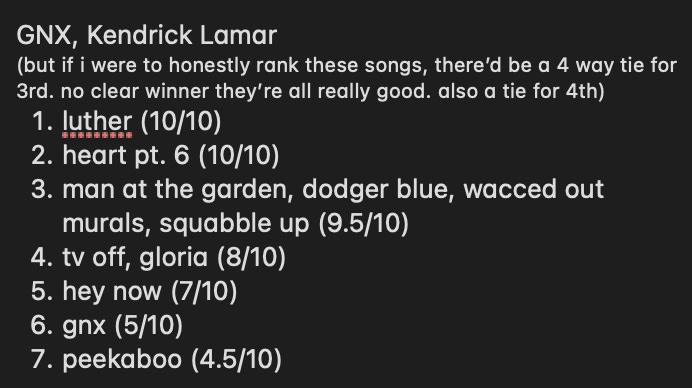 gnx: i think this one’s ahead of its time. rhythm, beat, n bars feel slightly off and just feels like he was messing around but maybe that’s what makes this somewhat innovative. also didn’t like the ending