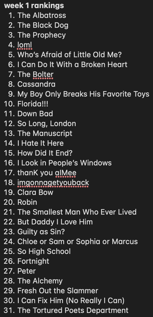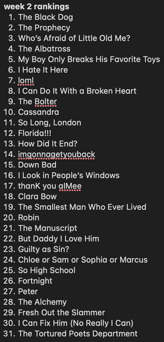 Her tour resumes next week and I’m curious to find out whether how she’ll incorporate TTPD into her setlist. I definitely anticipate seeing a Fortnight performance, but I’m unsure whether songs like I Can Do It With A Broken Heart and But Daddy I Love Him will make an appearance, considering I was wrong in assuming that her debut album would have a spot on her set and that You’re On You’re Own, Kid would make the Midnights section.